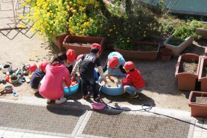 よく晴れた空の下,年長・すみれ組の子どもたちが卒園して,淋しくなった幼稚園ですが,年少・年中組の子どもたちが,園庭の玩具を水できれいに洗っていました。