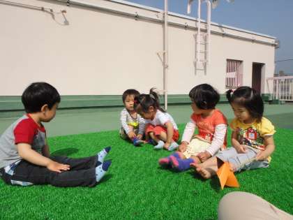 園庭で遊んでいた年少の子ども達は,こいのぼりを見つけて