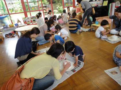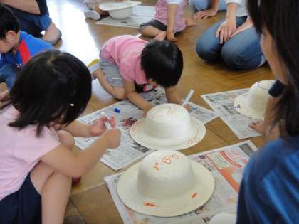 年少児は,今日のお迎えの時に,お母さんたちと一緒に麦わら帽子に絵をかいて,自分の