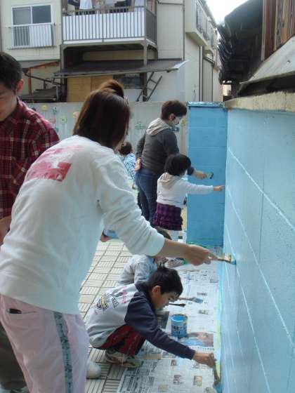 始めは園庭で遊んでいた子ども達も,お家の方が一生懸命ペンキ塗りをしてくださる姿を見て,「ぼくもするよ」「わたしもしてもいい?」と,参加をしました。