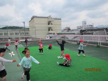 今週から、幼稚園の屋上に揚がったこいのぼり。今日も風をいっぱいに受けて、とても気持ちよさそうに泳いでいます。園庭や屋上では、かざぐるまを手に持った子どもたちが元気に駆けまわっています。今日の屋上は風が強く、子どもたちのかざぐるまも良く回り、みんな大喜びです。強い風でも寒さを感じることはなく、この時期の風は本当に心地よいです。
