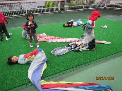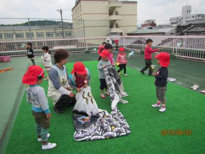 年少組の子どもたちは、お空に泳ぐ大きなこいのぼりを見たことはあっても、その大きなこいのぼりに実際にさわってみたり、中をのぞいてみたりするのは初めてだったようで、大きなこいのぼりの口の方から中を興味深そうにのぞいているうちに、何名かの子どもたちがその中に入って遊び始めました。かくれんぼのように全身でこいのぼりの中に隠れたり、お布団のように顔だけを出して寝転んでみたり…。思い思いにこいのぼりに親しむことができました。