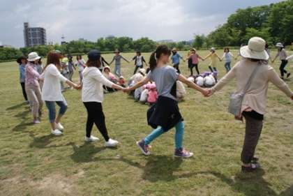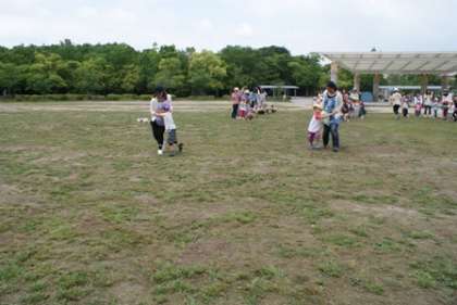 まず,保存展示してある市電の前でクラス毎に親子で記念写真をとったあと,芝生広場にてゲーム遊びをしました。