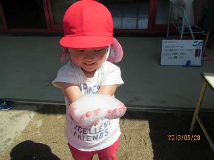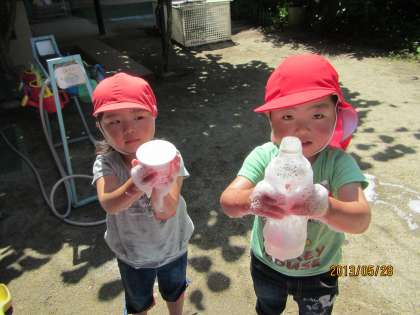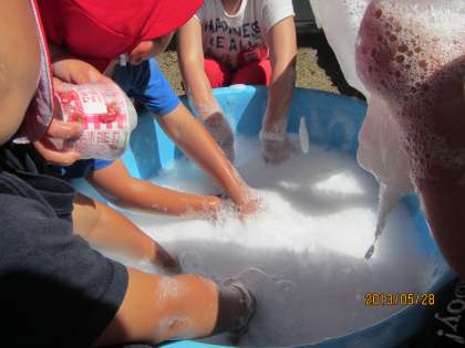 バケツに両手を突っ込んで,ジャブジャブと水を混ぜると泡がどんどん増えていきます。「ふわふわや〜」「お洗濯の匂いがするなぁ」など,泡の感触や石鹸の匂いを十分に楽しみながら遊んでいる子どもたち。