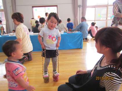 先週の土曜日の休日参観で、お家の人と一緒につくった“竹こっぽり”。出来上がるとさっそく乗って遊び出す子どもたちが多かったので、全員が週末に持ち帰って遊ぶことにしました。