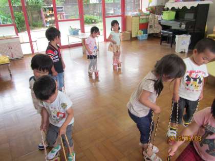 そして週が明けた今日、すっかり竹こっぽりにも慣れ、一層スムーズに乗りこなす子どもたちです。でも、乗れるか乗れないかが問題なのではありません。これからも竹こっぽりでいっぱい遊ぼうね♪