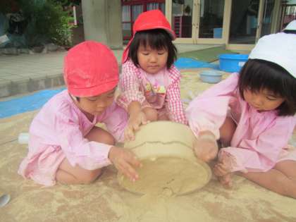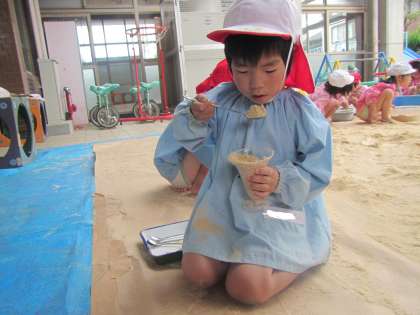 「アイスクリームできたよ!」「パフェどうぞ!」などカップに米ぬかを入れてご馳走作りを楽しむ子どもたちもいました。小さなカップに米ぬかを詰めてひっくり返して形ができることを楽しむ子どももいました。色々な形ができていくのが面白く,次から次へと色々なカップやトレイを使って型抜きを楽しんでしました。