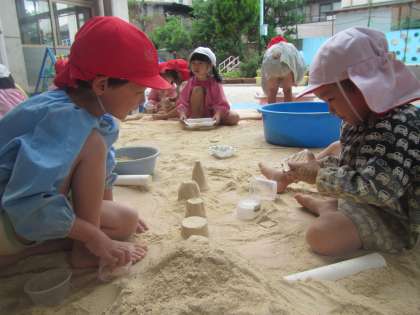 洗面器に米ぬかを入れてその上にトイレットペーパーの紙芯をろうそくに見立てて立てて,誕生日ケーキを作った子どもがいました。「○○ちゃんの(6月生まれのお友達)誕生日ケーキ!先生,歌おう♪」と誘ってくれました。一緒に歌ってお祝いをしました。