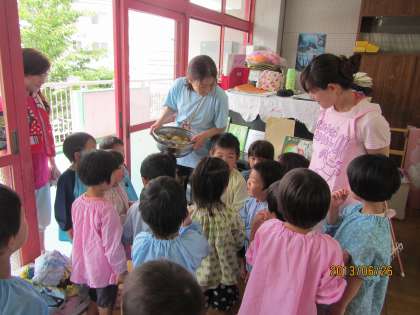 ジャガイモの皮むきは年中さんにお願いしようと、きれいに洗った野菜をみんなで2階の年中児“たんぽぽ組”の保育室まで届けました。