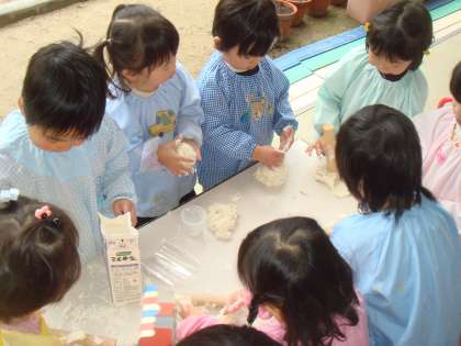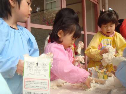 と大喜びでした。さっそく丸めたり、こねたり、のばしたり、たたいたり・・・小麦粉粘土の感触を楽しみながら、いろいろ試していました。