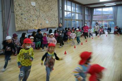 目標をもって走る年長・すみれ組の子どもたち。