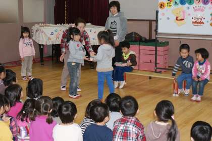 代表の年長児が誕生児にプレゼントやカードを渡し,