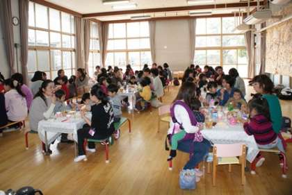 保護者も子どもも一緒に遊んだり,保護者や先生の出しものをみたり,みんなで会食をしたり,年長児が歌を歌ったり,盛りたくさんのお別れ会でした。寂しい気持ちもありましたが,笑いいっぱい,笑顔いっぱいの楽しい会になりました。
