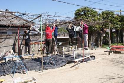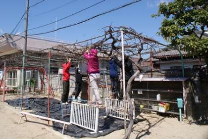 幼稚園をきれいにするのに,今日,教職員みんなで,ブドウ棚とブランコの錆を落としました。ペンキが剥げてきたので,新しくペンキを塗るためです。