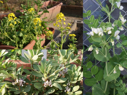 エンドウマメ,ソラマメ,ハクサイ,ムスカリ,ユキヤナギ,チューリップ,コムギ。