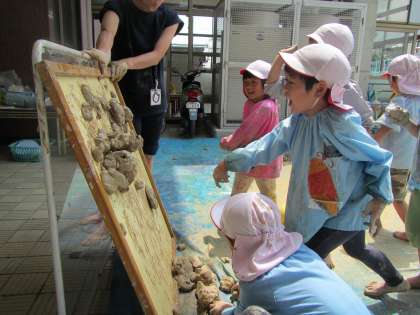 とっても楽しかった土粘土遊び!子どもたちは全身を使ってダイナミックに遊びました。「またしよ〜!」と続きを楽しみにしています。
