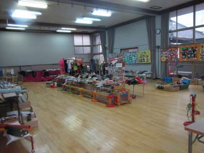 保育会のみなさんが,たくさんの物を用意してくださっています。お母さんたちの手づくりの物,リサイクル品(子ども服,おとな服など),日地用品(雑貨,食器など)あります。