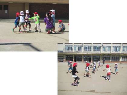 子どもたちは,広いグランドで遊ぶことが大好き。「小学校 行こうか」と声をかけると,「やった〜」とはりきって出かけています。