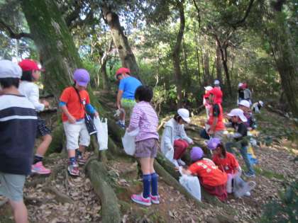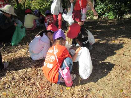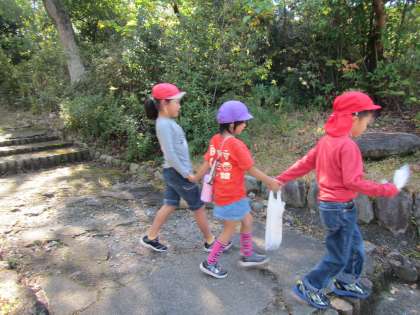 船岡山に着くと,昨年度にどんぐり拾いの経験のある子どもたちは,「先生,あっちの方にあるし行こう!」とどんどん進んで行きます。奥の林に着くと,紫野小学校の一年生もすでに遊びに来ていました。卒園児の友達もいて,「○○くんや!」と偶然の出会いを喜びました。「ここにあるよ」と一年生が教えてくれて一緒にどんぐりを拾いました。「あっちに松ぼっくりがあるよ」と手を繋いで松ぼっくりのある場所や違うどんぐりのある場所に連れて行ってくれました。手を繋ぐと心もほぐれたのか,子どもたちも自然と笑顔がみられました。一年生が見つけたどんぐりを渡してくれたり,手を繋いでゆっくり歩いてくれたり,お話したりしたことがとても楽しかったようです。
