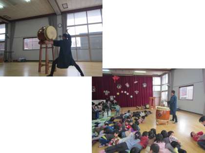 最初にうちわ太鼓・小さな太鼓・大きな太鼓など,子どもたちは目の前で成り響く太鼓の音を,耳で・目で・体で感じ楽しみました。リズミカルな太鼓の音色に自然と体が動き出し,踊り出す子どもたちの姿も微笑ましかったです。