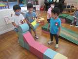 3歳児ちゅうりっぷ組では,円柱の積み木を転がして遊んでいたことをきっかけに,も...