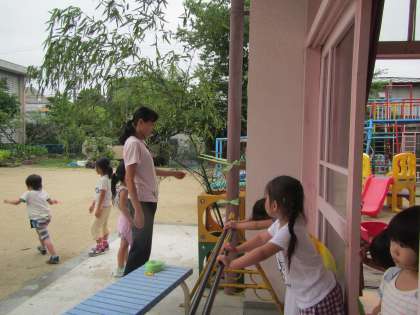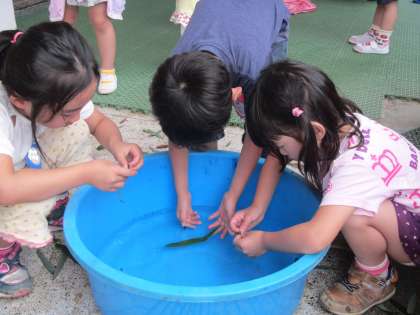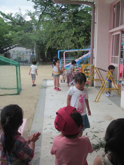 幼稚園に大きな笹が届きました。年長児が遊戯室の軒先に立ててくれています。「何かな何かな?」年少児が嬉しそうにやってきて拍手をしながら見守っています。「あ,笹や!」年中児も遊戯室からのぞいています。笹に飾りをつけたら,お星さまから見えるかな…また明日からが楽しみです。その横では,テラスに落ちていた笹の葉を集めて…“笹舟”づくりが始まりました。「何つくっているの?私もやりたい!」「どうするの?教えて」「うわあ!浮かんだ!」とても楽しそうです。