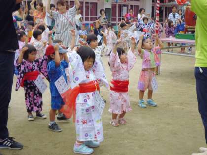 日ごろの行いが良すぎるのか、今のところ雨が降りません。夏祭りのスタートです。やぐらの周りで、「かぼちゃ音頭」「せんたく音頭」を子どもたちが中心になって踊っています。かわいいんです。
