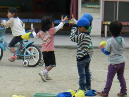 ひかり組は帽子とりをしています。年長さんの運動会の印象が大きいのでしょうね。何でもやってみたいエネルギッシュなひかり組です。