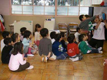 にじ組は,絵本の読み聞かせです。「見えるところに集まって」先生の声で集まってきました。自分遊びとみんなでの遊びでのメリハリが身についてきているにじ組です。