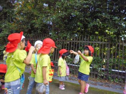 年少さんのはじめてのお出かけは、近くの天神さんです。2人ずつ手をつないて歩きます。気になるものを見つけると、歩行ストップ。つなぐ相手も変わってしまいます。まつぼっくりやどんぐり、きれいな葉っぱ、めずらしい小枝など袋に詰めていきます。静かにするといろいろな音が耳に飛び込んできます。甘い香りの赤い花がいっぱい咲いていました。いろいろなものに興味を持って遊びました。大きな天狗さんもぼくたちを見ていました。