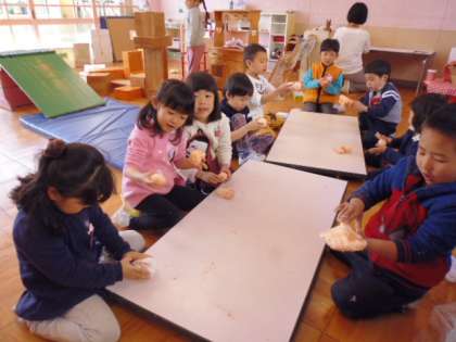 にじ組さんは、粘土を使って作り始めています。白いやわらかい粘土に絵具を混ぜて、うどんをこねるように、練っています。だんだんうすいピンク色の真ん丸になってきます。どうやら、人形の顔のようです。完成が楽しみです。