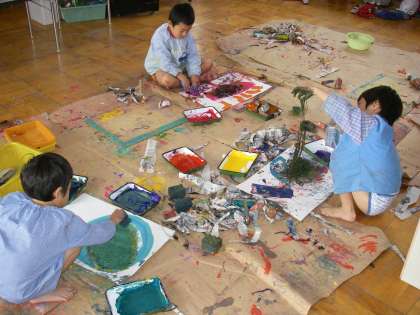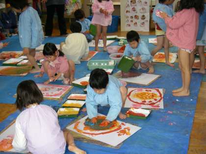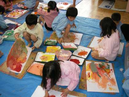 今日は年長さんも年中さんも絵の具遊びをしました。