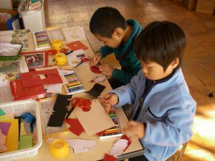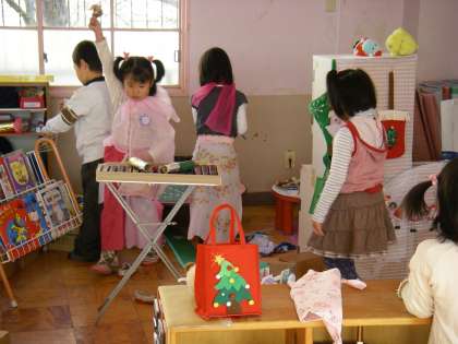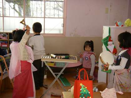 こちらでは集中してサンタさん作り。女の子たちは自分たちでカセットのスイッチを入れて曲に合わせてベルを鳴らしタンバリンを打って「ジングルベル・・・・」と歌いだしました。