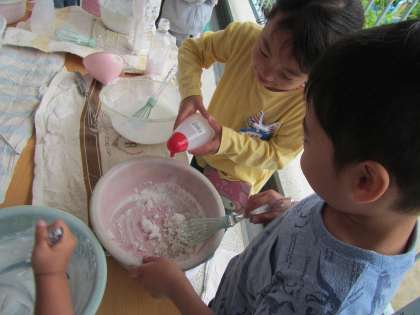 今日は一日雨空でしたが,そら組の子どもたちは保育室前のテラスで,じっくりたっぷり泡遊びを楽しみました。自分で石鹸を削り器で削って,水を調整しながら入れては泡だて器で泡をつくって遊びました。はじめはなかなか思うような泡になりませんが,根気よく混ぜると,フワフワの泡,ソフトクリームみたいな泡,ホイップのような泡,色々な泡をつくることを楽しんでいました。「明日は,このクリームでケーキ屋さんをするよ!」と,張り切るそら組の子どもたちでした!