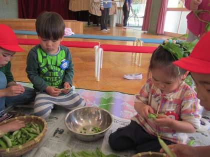 豆を収穫した後は,一つ一つ丁寧にさやから豆を取り出しました。「大きい豆や!」「11個も入ってた!」と,友達と見せ合う姿が見られました。そして,全部の豆をさやから取り出すと,ザルいっぱいになりました!量りで重さを量ると,なんと、なんと1350グラムもありました。前回収穫した時は900グラムだったので,合わせると2250グラム!さぁ,どんな豆ごはんになるか楽しみですね!!