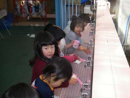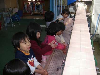 風邪やインフルエンザが流行る季節です。遊びが終わって帰る前に最後の手洗いうがいをします。「ゴロゴロ,ガラガラ」とうがいも上手になりました。石鹸で指の間までよく洗うこともできます。