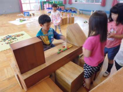 昼の保育が終わり、なかよしひろばに集まってきた子どもたち。16時までや18時までこのなかよしひろばで遊びます。いろいろなことにチャレンジしています。編み機を使って編み物をする子、丁寧に塗り絵をする子。こつこつ粘り強く友だちとドミノを並べている子たち。緊張しながら一つ一つ慎重に並べ、一気にバタバタバタ、爽快。そのドミノのコマを握りずしに見立てて、お寿司屋さん。カウンターの中に店の人、その前に1人のお客さんです。この後回転ずしに変わっていきます。2人の男の子は自動販売機作りです。そういえば必要な材料を職員室にもらいに来ていました。昼間の遊びで経験したことをそれぞれの子どもたちが変化を加えて、今日の遊びを作っていっているようです。なかよしひろばだからこそ、できる事なのかもしれません。お仕事しているおうちの人、安心してください。