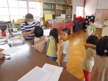 午後から歯科検診がありました。虫歯や歯並びなどを見ていただきました。年少さんも健康診断に慣れてきて、静かに待ったり診てもらったりしました。写真の年中さんもさすがお兄さんお姉さんになって、きちんと並びながらも、ちょっぴり前のお友だちが気になってのぞきこんだりしていました。みんなバッチリでした。