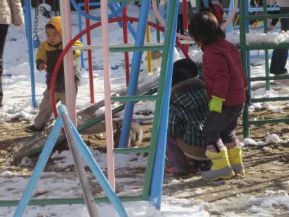 昨日は園庭の雪の上を走っていました。それを見て子どもたちも追いかけて走り回りました。ジャングルジムのところへ来たララちゃんです。未就園児(0歳から2,3歳)のタンポポ組さんも一緒に遊びました。