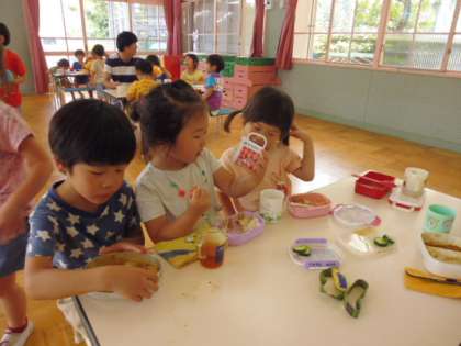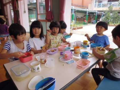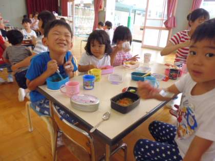 遊戯室にみんなが集まり、縦割りグループでいただきました。今日で退園するお友達とのお別れ会にもなりました。「元気でね」というみんなからの言葉にちょっぴり戸惑いながら、みんなでおいしくいただきました。さて隠し味はなんだったのでしょうか?そら組の子どもたちが「パパ・カレー」という本からヒントをもらった○○○です。ほんのりと甘く、パクッと食べた時に○○○の甘い香りが口から花に抜けました。ああ、おいしかった。ごちそうさん。