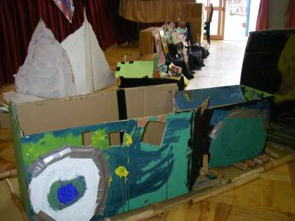どの組でも絵の具やダンボールペットボトル自然のものなどなどさまざまな素材に触れたり一緒にまみれて遊んできました。その中からそれらの素材を使ったり組み合わせたり自分なりに工夫して,自分の感動や自分で生み出してきたイメージなどを絵や立体物などに表現します。
