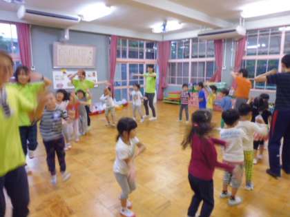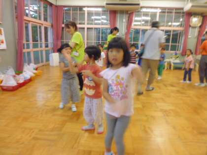 遊戯室では、夕涼み会が始まりました。まあ、エアコンが入っているので涼しいのですが。みんなで歌ったり、踊ったりしました。まだまだ元気です。ちょうど今、映画が始まりました。ここまでは大丈夫でしょう。でもこの後は、暗い中をグループで宝物を取りに幼稚園の中を探検します。おそろしい!感想は明日、おうちで聞いてください。