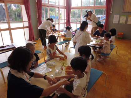 ロールパンに炒めたキャベツとウィンナーをはさんで、アルミホイルで包みます。牛乳パックに2個入れて、終わり。園庭で1つずつ並べ、パックの口に着火。どんどん燃えてきます。「おいしくなあれ、おいしくなあれ」掛け声とともに完成に近づきます。