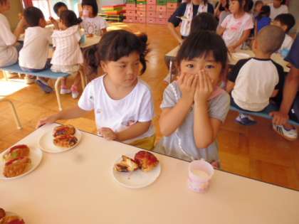 ちょっぴりおこげのついたホットドックが出来上がり。自分の好みでケチャップをつけて「いただきまーす」2個とも食べた子。ちょっと苦手でゆっくり食べている子。簡単ですから夏休み、一度おうちでも作ってみてください。