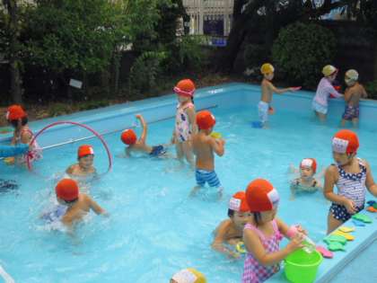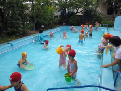 夏休みに入り、なかよしひろば(預かり保育)の子どもたちは、登園後プールに入りました。いつもと違って、3クラス一緒です。水に顔がつけられるようになった子は、何度ももぐったり、頭から水をかけたりしています。慣れない子どもも鼻をつまみながら顔をつけて頑張っていました。毎日入ることで少しずついろいろなことをクリアしていくのだと思います。