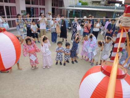 夕方5時半頃から、やぐらを囲んで「まんまる音頭」「せんたく音頭」をみんなで踊りました。園児はもちろんですが、小学生の子どもたちも覚えていて、楽しく踊っていました。最後は、保護者が手に持った6色のきらきらテープを流しました。夏祭り担当の皆さんは早くから準備をしていただき、ありがとうございました。そして今日参加して下った多くの方、最後の片づけまで手伝ってくださった方、ありがとうございました。