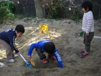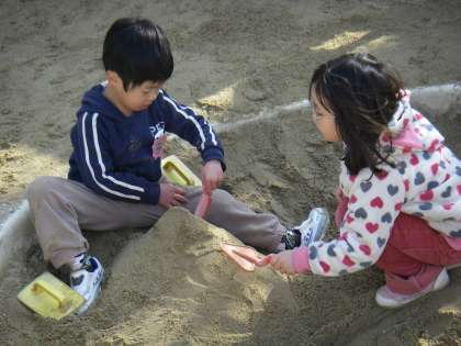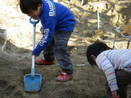 昨日のことです。雪の天気からお日様が出ると子どもたちは園庭や砂場に駆けてきました。早速砂遊びです。