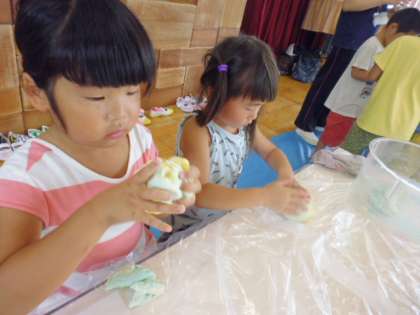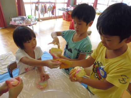 昨日の小麦粉粘土に絵具で色を付けると「あっ、おいしそうな色になった!」と、試しながら遊ぶ姿が見られました。昨日つくった小麦粉粘土を冷蔵庫に入れて保管していたので、ひんやりと冷たい小麦粉粘土になっていて「気持ちいいなぁ〜」と感触を楽しむ姿も見られました。自分でつくった粘土を友達と交換したり、違う色同士の小麦粉粘土を混ぜ合わせたりすることがとても楽しそうでした!