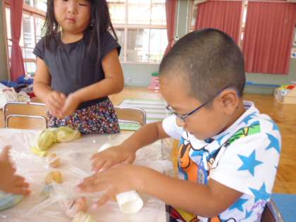なかよしひろばでは,この間から小麦粉粘土を使って遊んでいます。粘土に好きな色を混ぜてこねました。そして,渦巻パンを作ったり,メダルを作ったりして楽しみました。夢中になって遊んでいるときの子どもたちの表情は,素敵ですね。