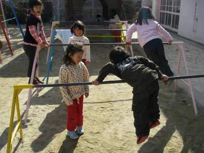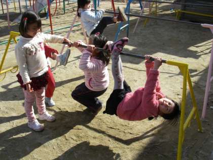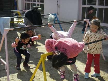 「先生鉄棒見せてあげようか」「見せて」「これはブタのまるやけ」「わたしもできる」「わたしも」